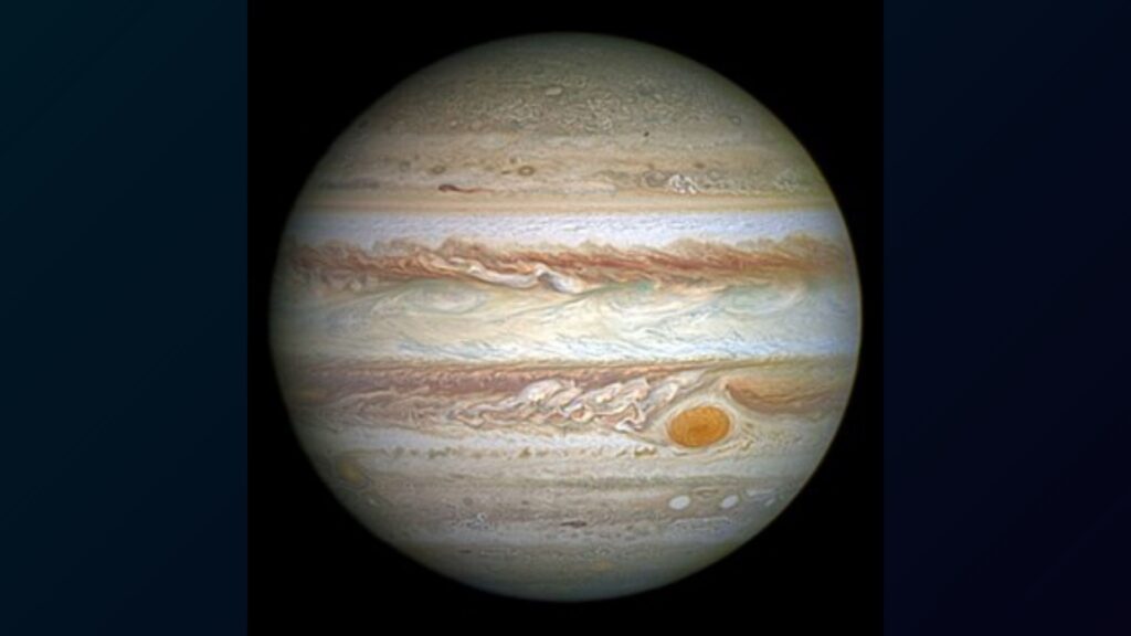 - Júpiter não tem superfície sólida — essas “texturas” são nuvens e tempestades gigantes.